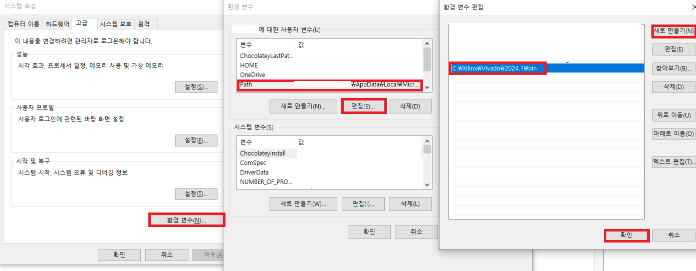 그 후에 환경 변수 > Path 선택 > 편집 > 새로 만들기 > Vivado 내부 bin 파일 주소. 로 적어주고 확인 후 종료.