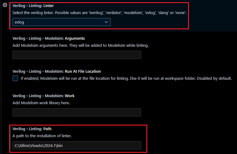 Linting 경로에 환경변수에서 잡은 Vivado 내부 bin 폴더 경로만 입력하면 끝이다.