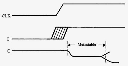 만약, Destination register의 setup/hold timing을 맞추지 못한 경우 register의 출력은 metastable 상태로 전환될 수 있다. 이러한 Metastable 상태에서의 register의 출력은 정상적으로 전환된 후에도 High와 Low의 사이값에 머무른다. 이러한 상황을 Metastability라고 한다.