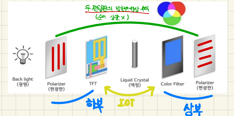 <LCD 구성> 그림에서 왼쪽부터 광원(BLU, Back Light Unit)이 출발해서 편광판을 지나 빛이 걸러집니다. 편광판을 지난 세로 모양의 빛이 TFT(Thin Film Transistor)를 지나 LC에 도착합니다. LC가 그대로 CF(Color Filter)로 간다면 가로모양의 편광판을 지날 수 없을 것입니다. 그렇기 때문에 우리는 전압을 인가하여 LC를 회전시킬 겁니다. 그렇게 된다면 편광판을 한 번 지나간 빛은 수직방향의 편광판을 통과하여 우리의 눈에 오게 됩니다.