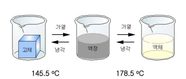 위와 같이 액정은 위치와 방향의 규칙성으로 분류했을 때, 고체와 액체의 중간성질을 갖는다 라고 알고 계시면 편합니다.