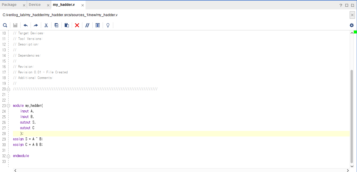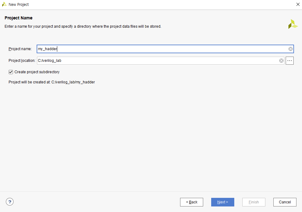 저는 Half Adder를 설계해 볼 것이기 때문에 파일명은 'my_hadder'로 했습니다. 그리고 C드라이브에 verilog용 폴더를 만들어 거기에 저장을 해줄 것입니다.