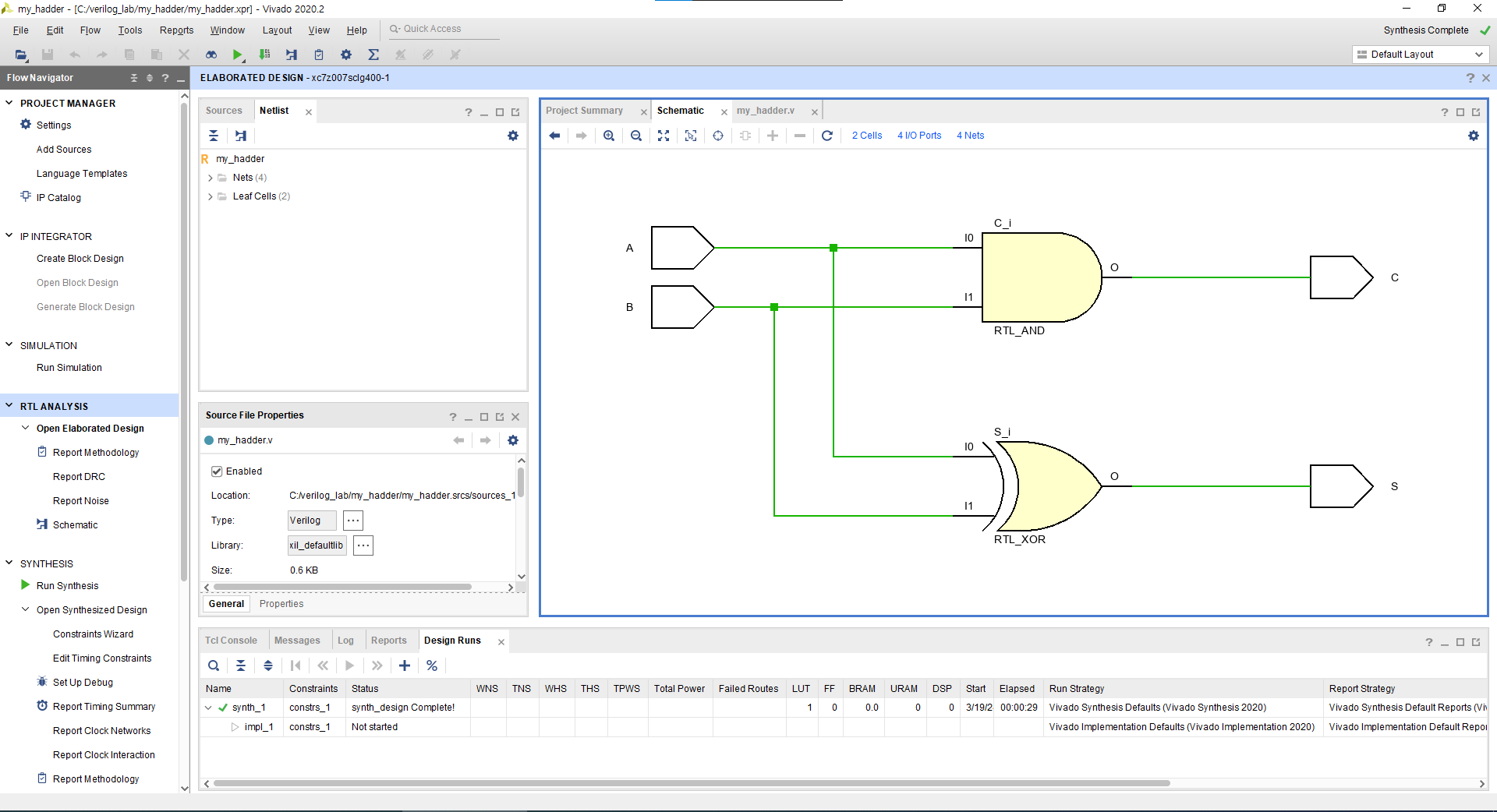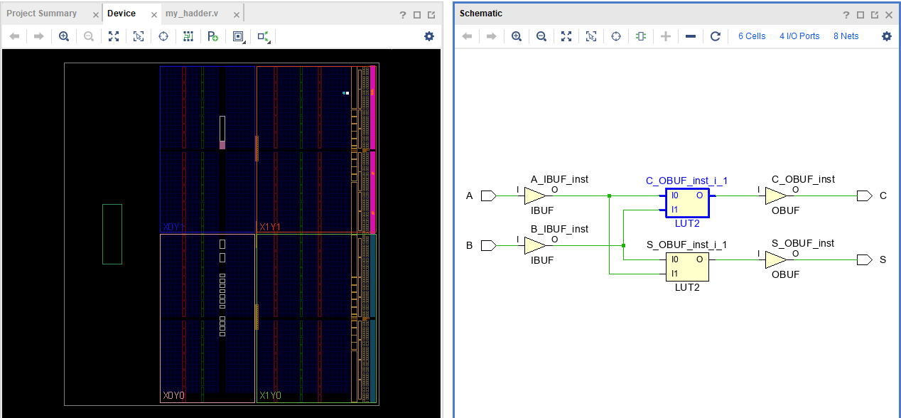 RTL Analysis에서 Open Elaborated Design, Schematic으로 회로가 정상적으로 구성되었는지 확인합니다. 제가 구성하려는 Half Adder와 일치하는 것을 확인할 수 있습니다.