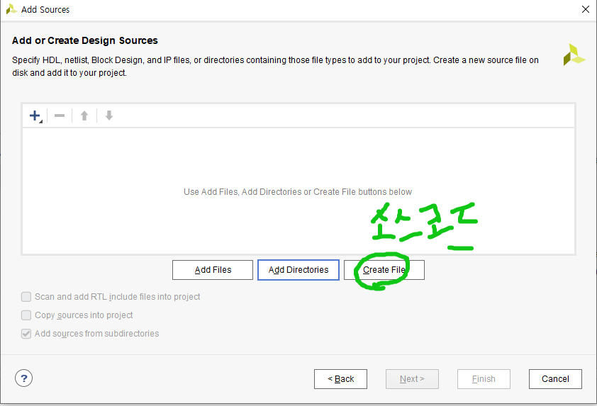 파일 명을 입력 후 Verilog 타입으로 파일 생성 후 Finish를 클릭합니다.