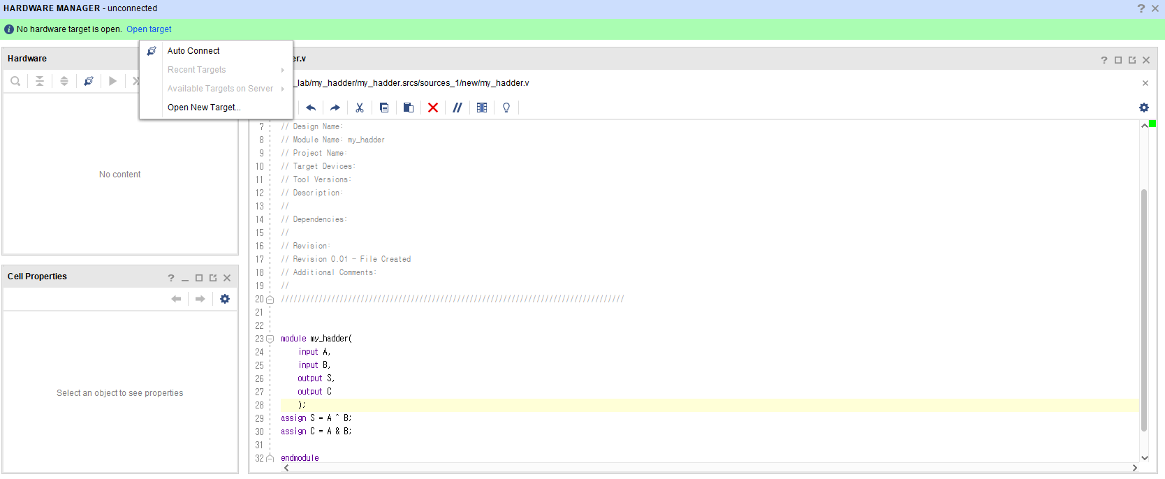 Generate Bitstream 후에 Hardware Manager에서 Open Target에서 Auto Connect를 선택하여 PC에서 컴파일하여 Deivce에 Upload 합니다.