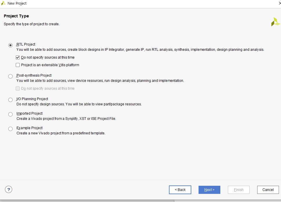 Source는 이따가 추가할 것이기 때문에 RTL Project에서 'Do not specify source at this time'을 선택 후 Next를 클릭합니다.