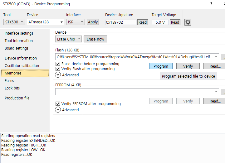Apply 버튼 옆에 Read 클릭 후 왼쪽 메뉴에서 Memories, Flash에서 Program을 클릭하면 모듈에 코드가 Upload 됩니다.