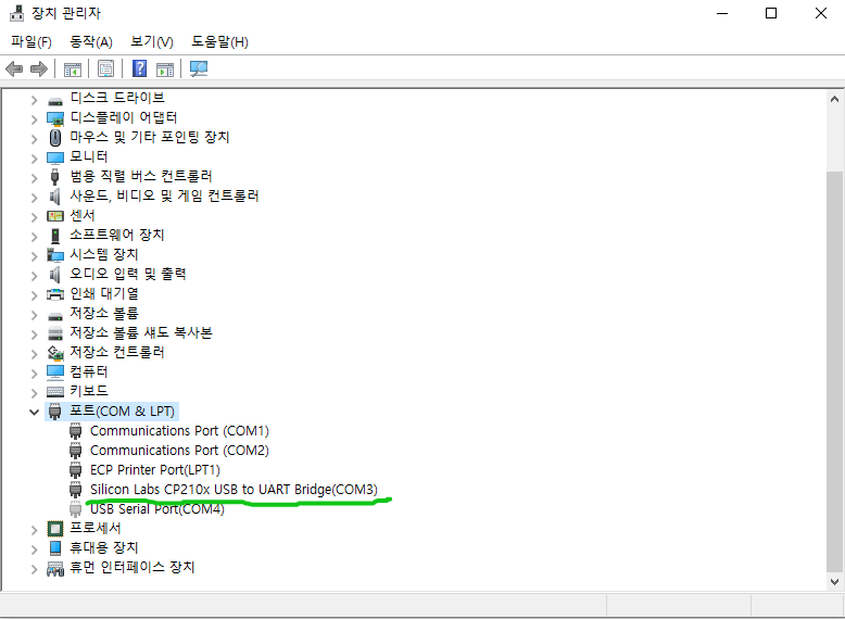 먼저 모듈을 PC에 연결시켜 준 후 장치관리자 - 포트에서 장치가 포트로 연결되어 있는 상태인지 확인합니다.