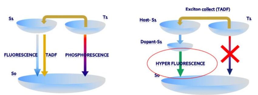 HF(Hyper Flourescence)는 TADF에 Host와 Dopant를 추가하여 색순도를 높이는 방식입니다.