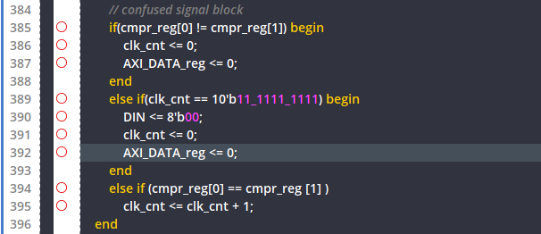 CLK마다 이전 값과 비교하여 일정 CLK이 증가하면 DIN, DOUT을 초기화하여 이전 DATA가 들어가는 일이 없도록 함.
