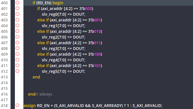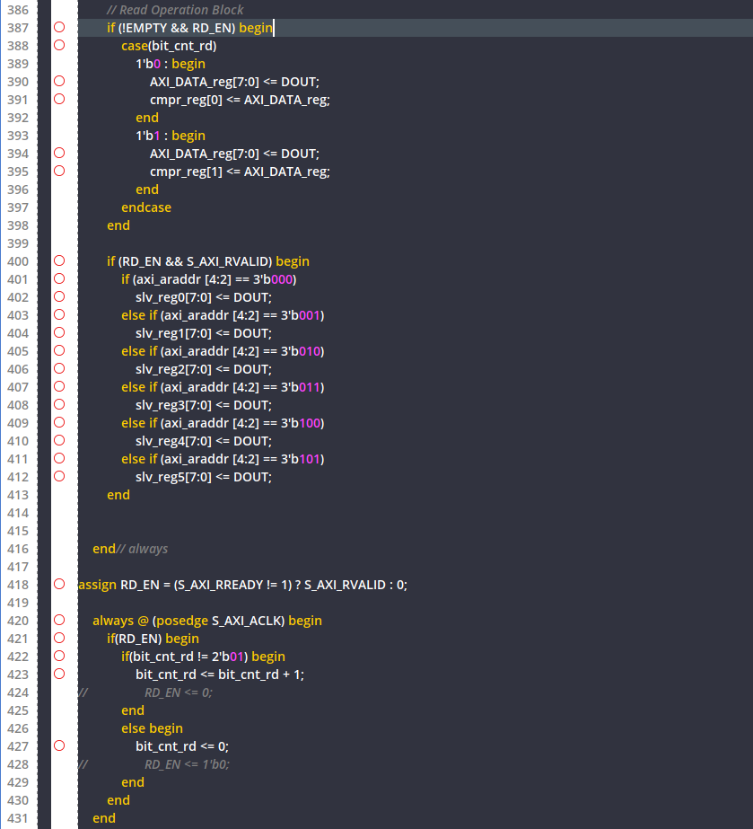위의 코드를 추가하여 DOUT으로 들어오는 RX_FIFO에 저장된 값을 AXI_Master가 불러오려는 slv_reg에 바로 넣어주면, Handshake가 일어날 때 값이 전송되도록 하는 코드입니다.