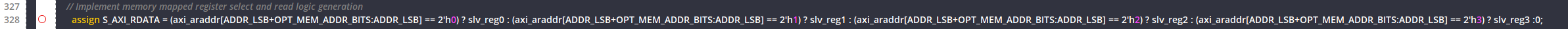 assign S_AXI_RDATA = (axi_araddr[ADDR_LSB+OPT_MEM_ADDR_BITS:ADDR_LSB] == 2'h0) ? slv_reg0 : (axi_araddr[ADDR_LSB+OPT_MEM_ADDR_BITS:ADDR_LSB] == 2'h1) ? slv_reg1 : (axi_araddr[ADDR_LSB+OPT_MEM_ADDR_BITS:ADDR_LSB] == 2'h2) ? slv_reg2 : (axi_araddr[ADDR_LSB+OPT_MEM_ADDR_BITS:ADDR_LSB] == 2'h3) ? slv_reg3 :0;