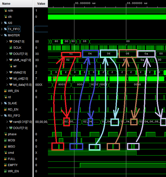 그전에 MISO에서 RX_FIFO의 RAM으로 값이 정상적으로 동작하지 않는 것을 확인하였습니다.