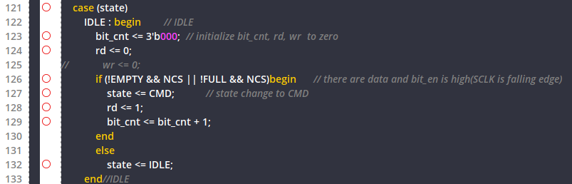 이렇게 되면 rd 신호가 거의 항상 동작하기 때문에 문제가 있을 수 있지만, 저는 FIFO에서 일정 시간 이후 값 변화가 없으면 0으로 초기화 하게 설정을 해두었기 때문에 MOSI로 0의 값만 나가서 동작에서 오류가 있지는 않습니다.