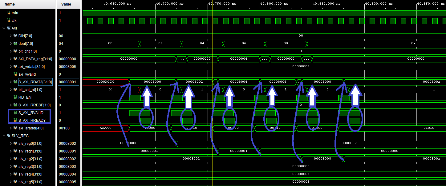 값이 현재 Testbench 상에서는 출력이 문제가 없지만, Master로 부터 오는 S_AXI_RREADY 신호가 Valid의 앞쪽이라면 잘못된 값이 전송될 수 있다. 그렇기에 RD_EN 신호를 ADDR Handshake와 연결하여 사용하면 이러한 문제점이 아래와 같이 해결된다.