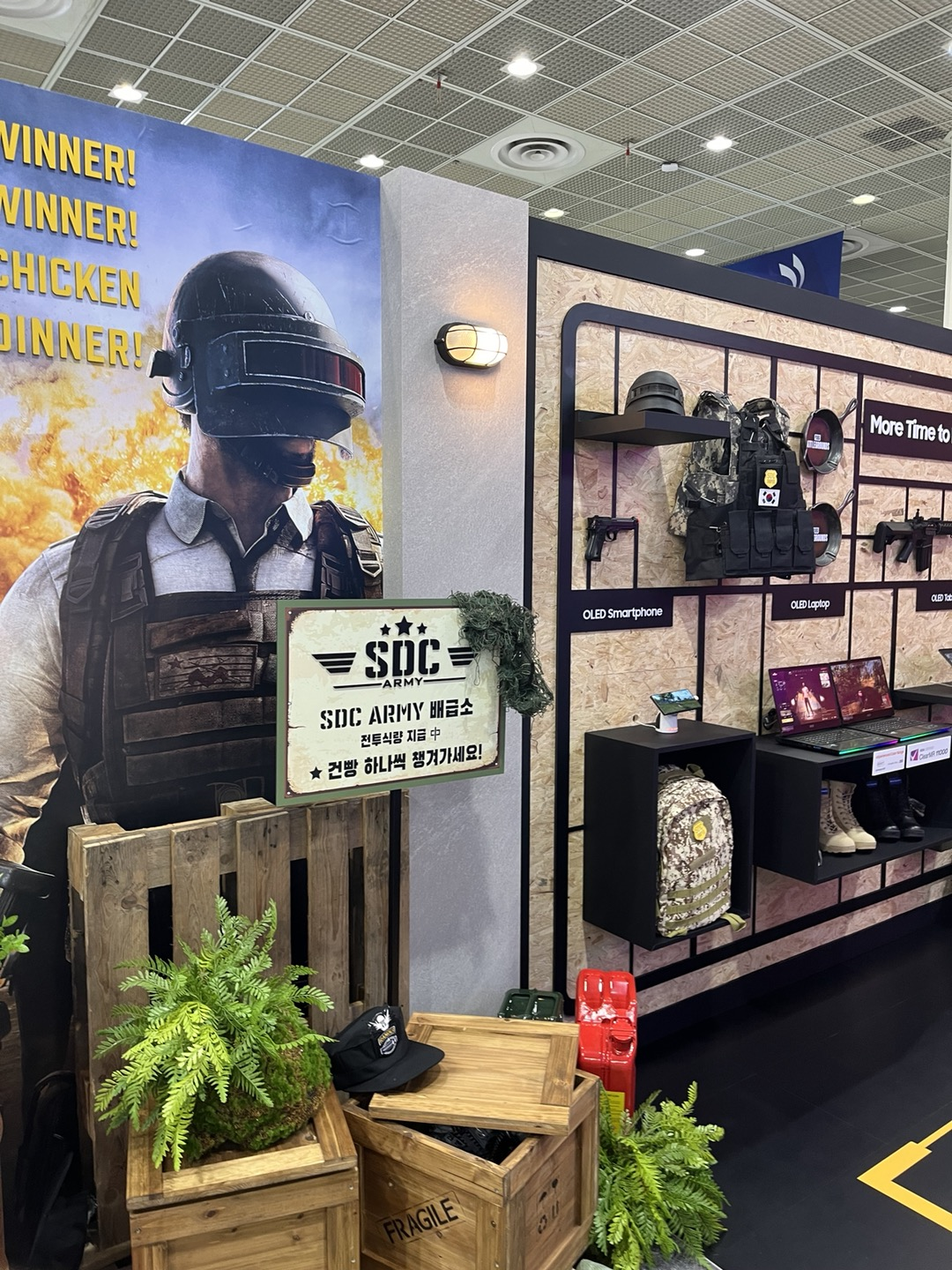 배그로 꾸며서 게이밍 모니터와 노트북을 보여줍니다.